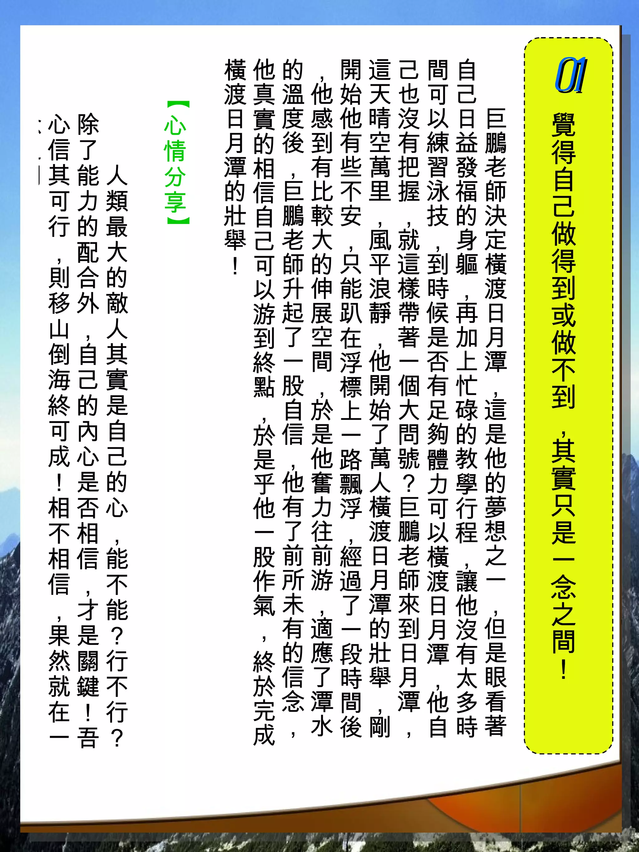 本文探讨了个人成长和信念的重要性,强调坚定的信心和自我价值感对于追求目标的影响。通过多方面的实践和经历,展示如何在困难中保持乐观、学习和适应,最终实现个人愿景。整体传达了积极的生活态度和对自我潜力的信任。