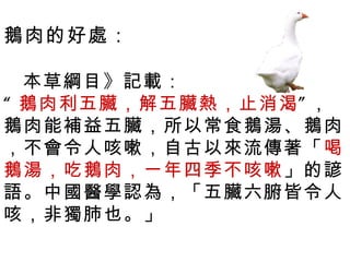 鵝肉利五臟,解五臟熱,止消渴” , 鵝肉能補益五臟,所以常食鵝湯、鵝肉 ,不會令人咳嗽,自古以來流傳著「喝 鵝湯,吃鵝肉,一年四季不咳嗽」的諺 語。中國醫學認為,「五臟六腑皆令人 咳,非獨肺也。」