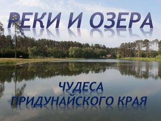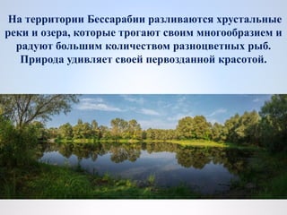 Документ описывает природные богатства Бессарабии, включая реки, озера и разнообразие рыб. Упоминаются известные озера, такие как Лебяжье и Кагул, а также проблемы экологии, такие как загрязнение и браконьерство. В области обитает множество видов рыб и птиц, что делает регион уникальным для туризма и отдыха.