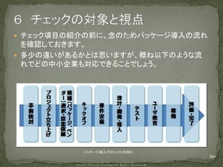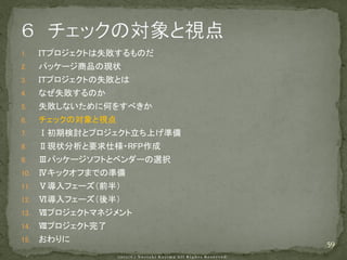 システム導入成功率は依然3割。 失敗するなら、やらないほうがマシ・・・、とならずに 確実にシステム導入を成功させるためのポイントを解説します。 中小企業診断士 システム監査技術者 小島規彰 http://www.asahi-bs.com/
