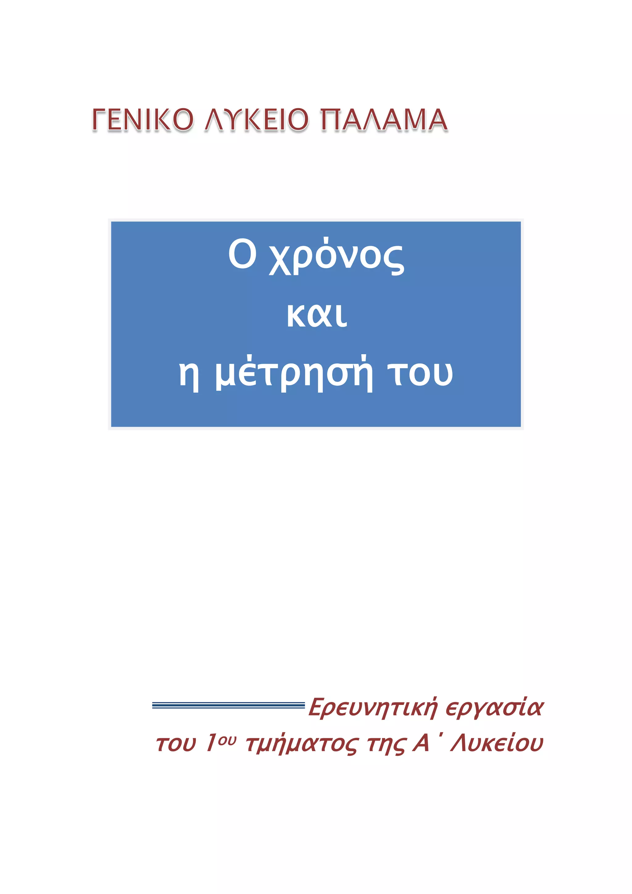 η μέηρηζή ηοσ 1 ΣΙΣΛΟ ΣΗ ΔΡΓΑΙΑ Ωο ηίηιν ηεο εξγαζίαο επηιέμακε ηνλ: “Ο ρξόλνο θαη ε κέηξεζή ηνπˮ δηόηη πξνζπαζή- ζακε λα θαηαιάβνπκε ηελ έλλνηα ηνπ ρξόλνπ θαη πσο κεηξάκε ηνλ ρξόλν. ΠΔΡΙΛΗΦΗ ηελ παξνύζα εξγαζία αξρηθά γίλεηαη κηα ζύληνκε αλαθνξά ζηελ έλλνηα ηνπ ρξόλνπ θαη πσο απηή εμειίρζεθε σο ζήκεξα. ηε ζπλέρεηα αλαθέξνληαη δύν εξγαιεία κέηξεζεο ηνπ ρξόλνπ, ην εκεξνιόγην θαη ην σξνιόγην θαη γίλεηαη κηα επηιεθηηθή πεξηγξαθή ηνπο. ην ηέινο πεξηγξάθεηαη ε δηαδηθαζία θαηαζθεπήο ελόο ειηαθνύ εκεξνινγίνπ, δηόηη ην Σκήκα καο επέιεμε λα θαηαζθεπάζεη έλα ειηαθό σξνιόγην ζηελ απιή ηνπ ρνιείνπ καο. ΚΟΠΟΙ Ωο ζθνπνύο ηεο εξγαζίαο ζέηνπκε ηνπο αθόινπζνπο: α) Να γίλεη ελεκέξσζε γηα ηελ έλλνηα “ρξόλνοˮ όπσο ρξεζηκνπνηείηαη ζηελ θαζεκεξη- λή δσή γεληθά θαη “ρξόλνοˮ ζηε Φπζηθή. β) Να γίλεη παξνπζίαζε δύν εξγαιείσλ κέηξεζεο ηνπ ρξόλνπ, ηνπ εκεξνινγίνπ θαη ηνπ σξνινγίνπ. γ) Να παξνπζηαζηνύλ ηα είδε εκεξνινγίνπ θαη ε ρξνληθή εμέιημή ηνπο. δ) Να παξνπζηαζηνύλ ηα είδε σξνινγίνπ θαη ε ρξνληθή εμέιημή ηνπο. ε) Να θαηαζθεπαζηεί ειηαθό σξνιόγην, ζηελ απιή ηνπ ρνιείνπ καο. Η ΟΜΑΓΑ ΔΡΓΑΙΑ ην 1ν Σκήκα ηνπ καζήκαηνο ηεο Δξεπλεηηθήο Δξγαζίαο ζπκκεηέρνπλ δεθαελλέα (19) καζεηέο. Δπηβιέπσλ θαζεγεηήο είλαη ν θ. Μπειηώθας Αδάκος, Φπζηθόο. Οη ζπκκεηέρνληεο καζεηέο είλαη νη αθόινπζνη:
