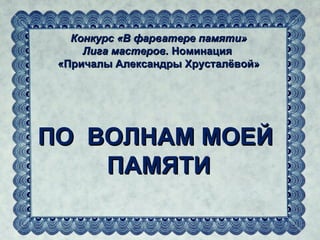 Документ описывает конкурс «В фарватере памяти» и воспоминания о преподавательнице Александре Хрусталёвой, которая обучала курсантов паровым котлам и дизельным установкам в сложные послевоенные годы. Главный акцент сделан на ее непризнанность изначально из-за пола, но с течением времени ученики начали ценить ее знания и опыт. В конце документ подчеркивает значимость преподавательской деятельности Хрусталёвой и ее вклад в обучение будущих механиков.