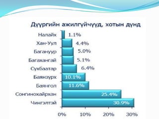 - #27 Энэ графикаас харахад нийт ажилгүйчүүдийн 30.9% нь Чингэлтэй, 25.4 % нь Сонгинохайрхан, 11.6% нь Баянгол, 10.1% нь Баянзүрх, 6.4% нь Сүхбаатар, 5.1 % нь Багахангай, 5.0% нь Багануур, 4.4 % нь Хан-Уул, 1.1% нь Налайх дүүрэгт тус тус амьдарч байна.