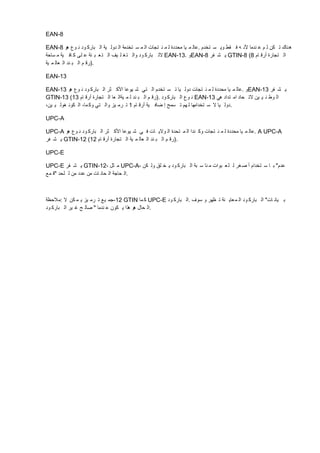 تناقش الوثيقة أنواع الباركود الأكثر استخدامًا، مثل 8-ean و31-ean وupc-a وupc-e. توضح الأرقام العالمية للمنتجات وكيفية استخدام كل نوع في السياقات المختلفة، مشيرة إلى أن 31-ean هو الأكثر شيوعًا في التجارة الدولية بينما upc-a يُستخدم بشكل أساسي في الولايات المتحدة. الوثيقة تسلط الضوء على تفاصيل محددة لكل نوع من أنواع الباركود وكيفية تعيينها.