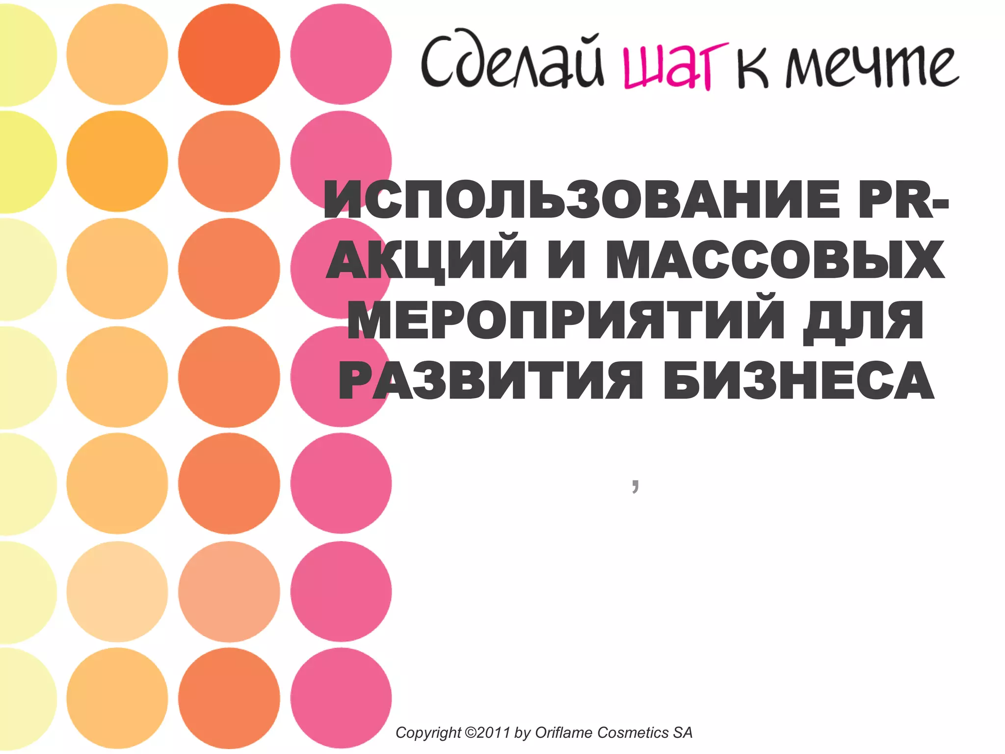 Документ описывает мероприятия, в которых участвует команда Oriflame в 2011 году, подчеркивая значимость PR-акций для развития бизнеса. Участвуя в городских праздниках и конкурсах, компания повышает свой имидж, устанавливает партнерские отношения и занимается благотворительностью. Также приводится алгоритм подготовки и участия в мероприятиях, включая этапы переговоров и взаимодействия с организаторами.