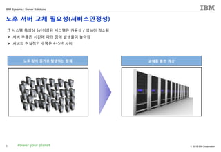 Corporation IBM Systems - Server Solutions 1 Power your planet IT 시스템 특성상 5년이상된 시스템은 가용성 / 성능이 감소됨 ➢ 서버 부품은 시간에 따라 장애 발생율이 높아짐 ➢ 서버의 현실적인 수명은 4~5년 사이 노후 장비 증가로 발생하는 문제 교체를 통한 개선 노후 서버 교체 필요성(서비스안정성)