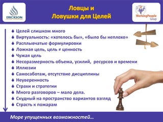 Документ рассматривает причины, по которым люди не достигают своих целей, включая слишком большое количество целей, неопределенность и самосаботаж. Он подчеркивает важность четкого определения целей и их взаимосвязи с ценностями, а также необходимость систематического подхода к их достижению через действия. В заключение упоминается, что целей можно достичь через мотивацию, веру и действия.