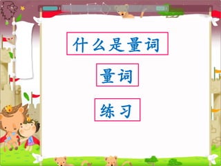 量词是用来表示人、事物或动作数量单位的词。文档介绍了不同量词的用法及其适用场景,并提供了一些练习以帮助记忆和理解。通过练习,读者可以掌握这些量词的使用方法。
