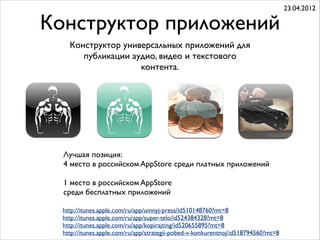 Документ представляет собой резюме Глеба Тарасова, опытного разработчика iOS-приложений, в котором перечислены его проекты, достижения и наилучшие позиции в App Store. Среди его работ - образовательные приложения, игры и инструменты для бизнеса, включая успешные проекты, такие как 'Кругозор: История' и 'Игры в слова'. Глеб Тарасов также работал над приложениями для клиентов различных компаний и специфическими приложениями, разработанными под NDA.