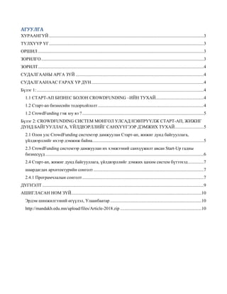 АРГА ЗҮЙ ...................................................................................................................4 СУДАЛГААНААС ГАРАХ ҮР ДҮН.....................................................................................................4 Бүлэг 1:......................................................................................................................................................4 1.1 СТАРТ-АП БИЗНЕС БОЛОН CROWDFUNDING –ИЙН ТУХАЙ...........................................4 1.2 Старт-ап бизнесийн тодорхойлолт...............................................................................................4 1.2 CrowdFunding гэж юу вэ ? .............................................................................................................5 Бүлэг 2: CROWDFUNDING СИСТЕМ МОНГОЛ УЛСАД НЭВТРҮҮЛЖ СТАРТ-АП, ЖИЖИГ ДУНД БАЙГУУЛЛАГА, ҮЙЛДВЭРЛЛИЙГ САНХҮҮГЭЭР ДЭМЖИХ ТУХАЙ..........................5 2.1 Олон улс CrowdFunding системээр дамжуулан Старт-ап, жижиг дунд байгууллага, үйлдвэрллийг ихээр дэмжиж байна....................................................................................................5 2.3 CrowdFunding системээр дамжуулан их хэмжээний санхүүжилт авсан Start-Up гадны бизнесүүд ..............................................................................................................................................6 2.4 Старт-ап, жижиг дунд байгууллага, үйлдвэрллийг дэмжих цахим систем бүтээхэд..............7 шаардагдах архитектурийн сонголт...................................................................................................7 2.4.1 Програмчлалын сонголт.............................................................................................................7 ДҮГНЭЛТ .................................................................................................................................................9 АШИГЛАСАН НОМ ЗҮЙ.....................................................................................................................10 Эрдэм шинжилгээний өгүүлэл, Улаанбаатар ..................................................................................10 http://mandakh.edu.mn/upload/files/Article-2018.zip .........................................................................10