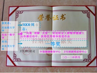 XXX 同 此处较大字 体 志: 在“沟通 · 理解 · 关爱” 促进职业人群精神健康大 此处一般字 体 众传播活动中,获得优秀媒体报道作品 奖项: 此处用大字 一等奖 体 中国健康教育中心 卫生部新闻宣传中心 二〇一二年四月