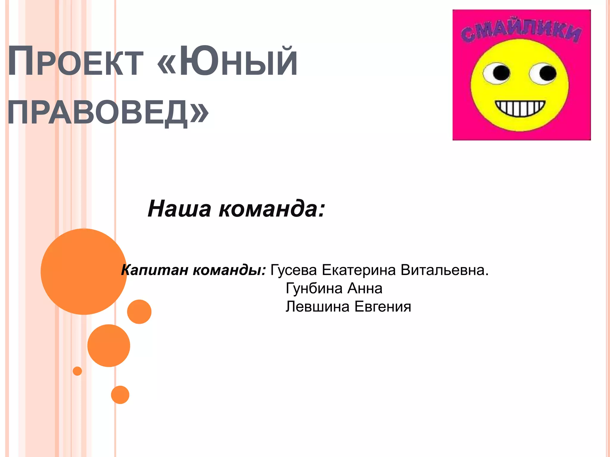 Документ посвящен проекту 'Юный правовед', в котором представлена информация о команде проекта. Капитаном команды является Гусева Екатерина Vitalьевна. В состав команды также входят Гунбина Анна и Левшина Евгения.