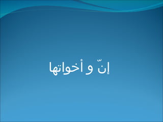 تناقش الوثيقة استخدام حروف 'إنّ' وأخواتها في اللغة العربية، موضحة معانيها المختلفة ودورها في تغيير الجمل. كما تتضمن أمثلة على كيفية استخدام هذه الحروف في جمل تؤكد وجود خبر معين، بالإضافة إلى تمارين تطبيقية لتعزيز الفهم. الوثيقة تشرح أيضًا القواعد النحوية المتعلقة بمرفوعات ومنصوبات هذه الجمل.