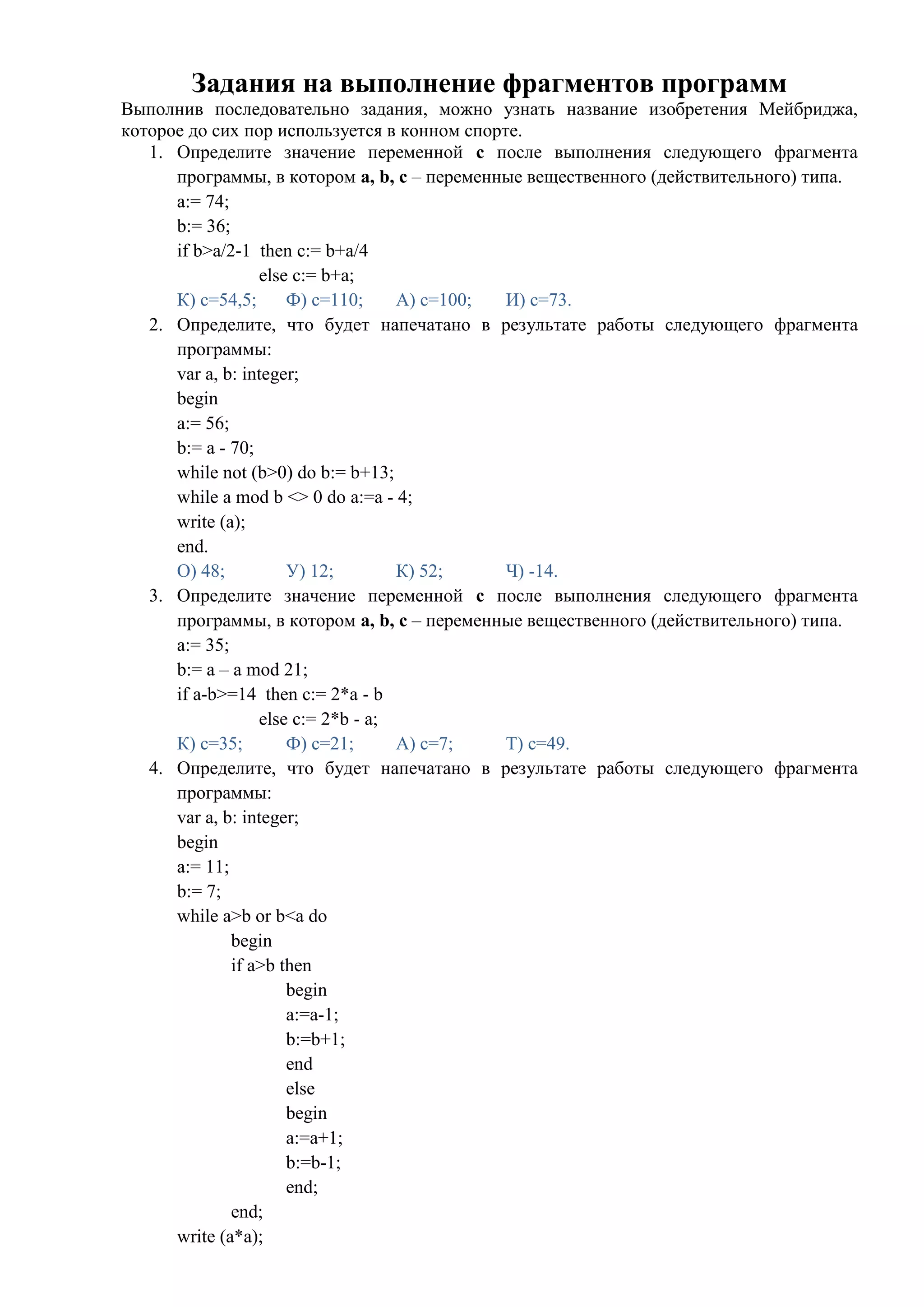Документ содержит задания на определение значений переменных и вывод данных после выполнения различных фрагментов программного кода, в которых используются переменные вещественного и целочисленного типов. Каждое задание включает условие и варианты ответов, из которых нужно выбрать правильный. Эти задания направлены на изучение работы с переменными и логическими операциями в программировании.