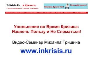 В видео-семинаре Михаила Тришина обсуждаются способы справляться с увольнением во время кризиса и извлекать из него пользу, приводя примеры личных историй людей, которые начали свой бизнес после потери работы. Упоминаются примеры успеха из различных секторов и стран, а также предоставляются советы для желающих начать собственное дело в сложные времена. Документ завершает практическим руководством по организации бизнеса и юридическим аспектам его регистрации.