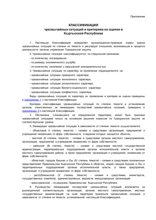 Документ представляет классификацию чрезвычайных ситуаций в Кыргызской Республике и критерии их оценки по степени тяжести, включая организационно-правовые нормы управления и ликвидации последствий. ЧС подразделяются на природные, техногенные, экологические, биолого-социальные и конфликтные, а их оценка основывается на количестве пострадавших, экономическом ущербе и нарушении жизнедеятельности. Также описаны процедуры ликвидации ЧС в зависимости от их степени тяжести и ответственность органов управления за принятие необходимых мер.