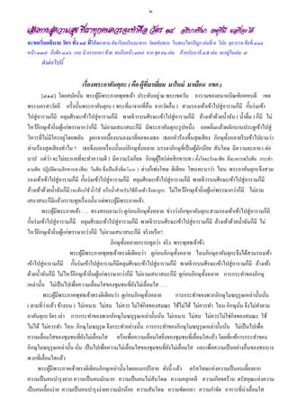[๒๒๕] สมัยนั้น พื้นดินหยาบไป สี ดาไม่จบ . .. ตรัสว่า ดูกอนภิกษุท้ งหลาย ั ่ ั เราอนุญาตให้ใช้ดินปนแกลบ แล้วกวดด้วยเกรี ยง สี ดาจะไม่จบ ั สี ดาก็ยงไม่จบ ภิกษุท้ งหลายกราบทูลเรื่ องนั้นแด่พระผูมีพระภาคเจ้า พระผูมีพระภาคเจ้าตรัสว่า ดูก่อนภิกษุท้ งหลาย เราอนุ ญาตให้ใช้ยางไม้ น้ าฝาด. ั ั ั ้ ้ ั พุทธานุญาตภาพดอกไม้เป็ นต้น [๒๒๖] สมัยนั้น พระฉัพพัคคียให้ช่างเขียนภาพสตรี บุรุษไว้ในวิหาร ชาวบ้านเที่ยวชมวิหารเห็นเข้า จึงเพ่งโทษ ติเตียน โพนทะนาว่า. .. เหมือนพวกคฤหัสถ์ผบริ โภคกาม . ์ ู้ . . ภิกษุท้ งหลายกราบทูลเรื่ องนั้นแด่พระผูมีพระภาคเจ้าพระผูมีพระภาคเจ้าตรัสว่า ดูก ั ้ ้ ่อนภิกษุท้ งหลาย ภิกษุไม่พึงให้เขียนภาพสตรี บุรุษ รู ปใดให้เขียน ต้องอาบัติทุกกฏ เรา ั อนุญาตภาพดอกไม้ ภาพเครื อเถา ฟันมังกร ดอกจอกห้ากลีบ. เรื่ องวิหารมีพ้ืนที่ต่า [๒๒๗] สมัยนั้น วิหารมีพ้ืนต่า น้ าท่วมได้ ภิกษุท้ งหลายกราบทูลเรื่ องนั้นแด่พระผูมีพระภาคเจ้า พระผูมีพระภาคเจ้าตรัสว่า ดูกอนภิกษุท้ งหลายเราอนุญาตให้ถมพื้นที่ ั ้ ้ ่ ั ให้สูง ดินที่ถมพัง . . . ตรัสว่า ดูก่อนภิกษุท้ งหลายเราอนุญาตก่อกรุ ๓ อย่าง คือ ก่อด้วยอิฐ ๑ ศิลา ๑ ไม้ ๑ ภิกษุท้ งหลายขึ้นลงลาบาก . . .ตรัสว่า ดูก่อนภิกษุท้ งหลาย เรา ั ั ั อนุญาตบันใด ๓ อย่าง คือบันใดอิฐ ศิลา ไม้ ภิกษุท้ งหลายขึ้นลงพลัดตก. . .ตรัสว่า ดูก่อนภิกษุท้ งหลาย เราอนุญาตราวสาหรับยึด. ั ั เรื่ องวิหารมีพ้ืนโล่งโถง [๒๒๘] สมัยนั้น วิหารมีพ้ืนโล่งโถง ภิกษุท้ งหลายละอายที่จะนอน จึงกราบทูลเรื่ องนั้นแด่พระผูมีพระภาคเจ้า พระผูมีพระภาคเจ้าตรัสว่า ดูก่อนภิกษุท้ งหลาย เรา ั ้ ้ ั อนุญาตผ้าม่าน ภิกษุท้ งหลายเลิกผ้าม่านมองดูกน ภิกษุท้ งหลายกราบทูลเรื่ องนั้นแด่พระผูมีพระภาคเจ้า พระผูมีพระภาคเจ้าตรัสว่า ดูก่อนภิกษุท้ งหลาย เราอนุญาตฝากึ่ง ั ั ั ้ ้ ั หนึ่ง คนมองดูขางบนจากฝากึ่งหนึ่งได้ภิกษุท้ งหลายกราบทูลเรื่ องนั้นแด่พระผูมีพระภาคเจ้า พระผูมีพระภาคเจ้าตรัสว่า ดูก่อนภิกษุท้ งหลาย เราอนุญาตห้อง ๓ ชนิด คือ ห้อง ้ ั ้ ้ ั สี่ เหลี่ยมจตุรัส ๑ ห้องยาว ๑ ห้องคล้ายตึกโล้น ๑. เรื่ องวิหารเล็ก [๒๒๙] สมัยนั้น วิหารเล็ก ภิกษุท้ งหลายกั้นห้องไว้ตรงกลางอุปจารไม่มี จึงกราบทูลเรื่ องนั้นแด่พระผูมีพระภาคเจ้า พระผูมีพระภาคเจ้า ั ้ ้ ่ ตรัสว่า ดูกอนภิกษุท้ งหลาย เราอนุญาตให้ทาห้องไว้ส่วนข้างหนึ่งในวิหารเล็กแต่ในวิหารใหญ่ทาไว้ตรงกลางได้. ั [๒๓๐] สมัยนั้น เชิงฝาวิหารเก่า ภิกษุท้ งหลายกราบทูลเรื่ องนั้นแด่พระผูมีพระภาคเจ้า พระผูมีพระภาคเจ้าตรัสว่า ดูกอนภิกษุท้ งหลาย เ