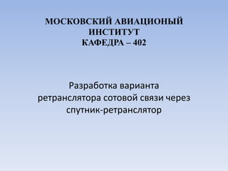 Документ описывает разработку ретранслятора сотовой связи через спутник и стандарты Inmarsat. Также рассматриваются преимущества системы BGAN, включая глобальное покрытие, высокую скорость передачи данных и простоту использования. Приводятся характеристики систем Inmarsat и Globalstar, а также параметры передачи данных и моделирование нагрузки на канал.