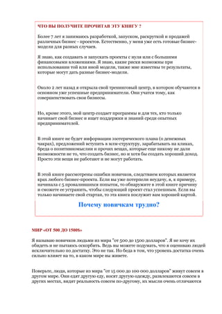 Книга посвящена сильным женщинам и различным типам новичков в бизнесе, освещая ошибки и трудности, с которыми они сталкиваются. Автор делится своим опытом создания и продвижения бизнесов, предлагая модели и пути к успеху для тех, кто готов действовать. Основное внимание уделяется необходимости обучения и стремлению к развитию в бизнесе, а также разбору мифов о легком обогащении.