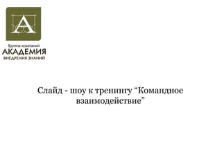 Документ представляет собой презентацию тренинга по командному взаимодействию, подчеркивающую разницу между командами и группами. Команды проявляют взаимозависимость, доверие и стремление к общим целям, в то время как группы часто функционируют на основе индивидуальных интересов и неэффективного общения. Успех команд зависит от открытой поддержки, участия в принятии решений и способности к конструктивному разрешению конфликтов.