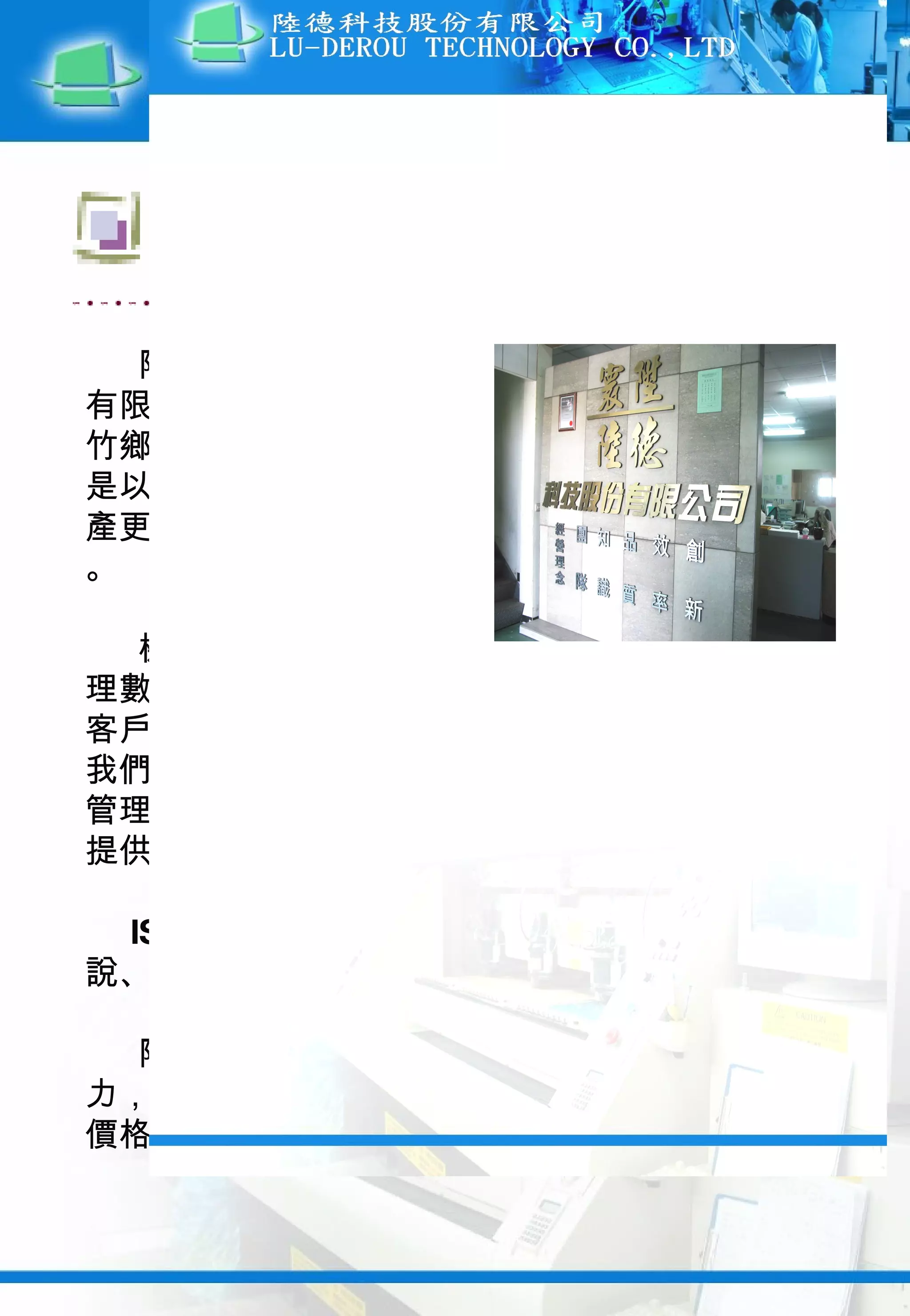 陸德科技股份有限公司位於桃園縣,致力於生產高品質和穩定的產品,通過ISO 9001品質標準認證,並在客戶和員工之間建立公平的合作關係。公司擁有多種自動化設備和強大的技術研發能力,專注於創新和持續改善,以實現企業的永續發展目標。未來,公司將在不斷調整策略下,為客戶提供競爭力價格的高品質產品。