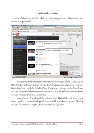 YouTube ให้ทําการพิมพ์ URL : http://www.youtube.com ที่ช่อง address ของ Browser จะเข้าสู่หน้าจอดังนี้ สําหรับลงทะเบียนสมาชิกใหม สําหรับสมาชิกที่เคยลงทะเบียนไวแลว โดยมีเมนูสําหรับดําเนินการในเรื่องของการสมัครสมาชิกอยู่ทางด้านขวามือชื่อเมนู Create Account ใช้สําหรับดําเนินการสมัครสมาชิกใหม่ของ YouTube โดยสิ่งที่จําเป็นในการสมัครเป็นสมาชิกของ YouTube ก็คืออีเมล์ของ Gmail หากผู้สมัครท่านใดไม่ได้เป็นสมาชิกของ Gmail ในช่วงของการสมัครเป็นสมาชิกของ YouTube ก็จะการจัดการให้ผู้สมัครกรอก Email Address ของ Gmail ด้วย ดังนั้นเมื่อท่านสมัครสมาชิกของ YouTube ก็จะเป็นสมาชิกของ Gmail ไปโดยปริยาย ส่วนเมนู Sign In มีไว้สําหรับสมาชิกที่ลงทะเบียนกับ Gmail ไว้แล้ว หรือมี Email Address ของ Gmail อยู่แล้ว สามารถลงทะเบียนเข้าสู่ส่วนที่เป็นของสมาชิกได้เลย หากต้องการ Upload วิดีโอขึ้นสู่ YouTube จําเป็นต้อง Sign In เข้าสู่ระบบสมาชิกก่อนจึงจะสามารถ Upload ได้ การออกแบบการเรียนการสอน โดยใช้สื่อสังคมเพื่อพัฒนาการเรียนรู้ในยุคดิจิตอล หน้า 1