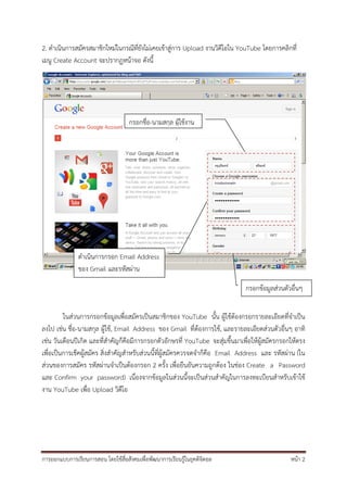 งานวิดีโอใน YouTube โดยการคลิกที่ ั เมนู Create Account จะปรากฏหน้าจอ ดังนี้ กรอกชื่อ-นามสกุล ผู้ใช้งาน ดําเนินการกรอก Email Address ของ Gmail และรหัสผ่าน กรอกข้อมูลส่วนตัวอื่นๆ ในส่วนการกรอกข้อมูลเพื่อสมัครเป็นสมาชิกของ YouTube นั้น ผู้ใช้ต้องกรอกรายละเอียดที่จําเป็น ลงไป เช่น ชื่อ-นามสกุล ผู้ใช้, Email Address ของ Gmail ที่ต้องการใช้, และรายละเอียดส่วนตัวอื่นๆ อาทิ เช่น วันเดือนปีเกิด และที่สําคัญก็คือมีการกรอกตัวอักษรที่ YouTube จะสุ่มขึ้นมาเพื่อให้ผู้สมัครกรอกให้ตรง เพื่อเป็นการเช็คผู้สมัคร สิ่งสําคัญสําหรับส่วนนี้ที่ผู้สมัครควรจดจําก็คือ Email Address และ รหัสผ่าน (ใน ส่วนของการสมัคร รหัสผ่านจําเป็นต้องกรอก 2 ครั้ง เพื่อยืนยันความถูกต้อง ในช่อง Create a Password และ Confirm your password) เนื่องจากข้อมูลในส่วนนี้จะเป็นส่วนสําคัญในการลงทะเบียนสําหรับเข้าใช้ งาน YouTube เพื่อ Upload วิดีโอ การออกแบบการเรียนการสอน โดยใช้สื่อสังคมเพื่อพัฒนาการเรียนรู้ในยุคดิจิตอล หน้า 2