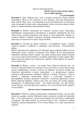Документ посвящен роли песен в жизни солдат во время Великой Отечественной войны, подчеркивая, что они были не только средством выражения чувств, но и важным моральным поддержкой для бойцов. Каждая из упомянутых песен, таких как 'Священная война' и 'Катюша', стала символом патриотизма и стойкости, олицетворяя надежду и мужество народа в тяжелые времена. В конце текста акцентируется, что память о войне и героях будет жить в сердцах будущих поколений.