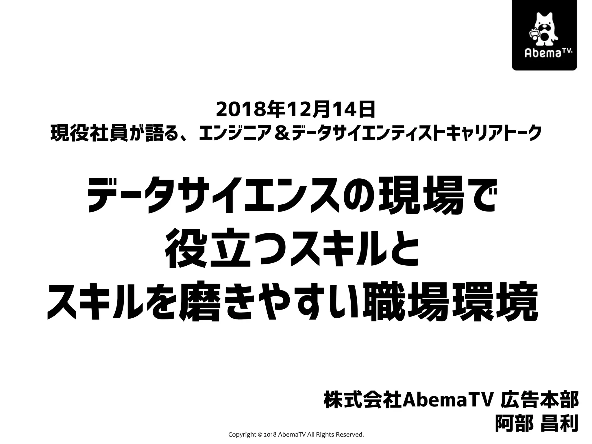 AbemaTV All Rights Reserved. 2018年12月14日 現役社員が語る、エンジニア&データサイエンティストキャリアトーク データサイエンスの現場で 役立つスキルと スキルを磨きやすい職場環境 株式会社AbemaTV 広告本部 阿部 昌利