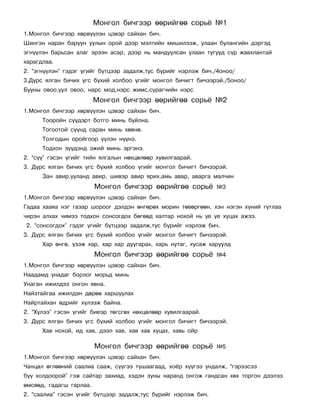 ñîðü¸ ¹307 1.Ìîíãîë áè÷ãýýð õºðâ¿¿ëýí öýâýð ñàéõàí áè÷. Ò¿¿õ Èæèéãýý í¿äíèé õîð ãàðãàõ ãýýä õàæóóëààä îðõèìîãö ë “Àà, ÷è õýâòýýä àâàâ óó?” ãýñýí øèã óéëààä óíàäàã ¿ð áàéäàã. Ò¿¿í ë¿ãýý àäèë ò¿¿õ ãýäýã áîë õ¿íèéã óíòàõ ãýýä ç¿¿ðìýãëýìýãö ë ¿ðãýëæ ñýðýýãýýä ýõýëäýã “õýë ìýäýõã¿é õ¿¿õýä” þì. ªíãºðñíèé ò¿¿õ íü ¿ðãýëæ äóóäàæ ñýðýýäýã “õýë ìýäýõã¿é õ¿¿õýä” þì. 2. “óéë” ãýñýí ¿ãèéã íºõöºëä¿¿ëýí õîëáîõ íºõöºëèéí õóâèëëààð õóâèëãà. 3. Äàðààõ õýñãèéã áè÷ãèéí ãàëèãààð õºðâ¿¿ëæ áè÷. Ìîíãîë áè÷ãýý𠺺ðèé㺺 ñîðü¸ ¹308 1.Ìîíãîë áè÷ãýýð õºðâ¿¿ëýí öýâýð ñàéõàí áè÷. Öýöýã á¿õýí îíäîî. Ãàë àäèë óëàëçàí áàéäàã ñàðíàé, òýíãýð àäèë öýíõýðëýí áàéäàã óäâàë, óñíû àð äýýð ÷èìýã áîëñîí àëòàðãàíà, óóë òàëûí ÷èìýã áîëñîí ä¿íæèíãàðàâ, ñàëõèíä áºíæèãíºõ人 äóóãàðàõ íü ë äóòóó áàéäàã õîíõîí öýöýã, ñàö áàñ öýöýãëýõäýý ãýðýëòýõ íü ë äóòóó áàéäàã àëòàí çóë, ÿíàã õàëóóí ñýòãýëèéí áýëýã áîëñîí áýð öýöýã, ÿðóó ¿çýìæèéí òýìäýã áîëñîí õàéòàí öýöýã, àëü öýöãèéã òîîëæ áàðàõ âý. 2. “ áîë” ãýñýí ¿ãèéã áèåýð òºãñãºõ íºõöºëèéí õóâèëëààð õóâèëãà. 3. Äàðààõ õýñãèéã áè÷ãèéí ãàëèãààð õºðâ¿¿ëæ áè÷. Ìîíãîë áè÷ãýý𠺺ðèé㺺 ñîðü¸ ¹309