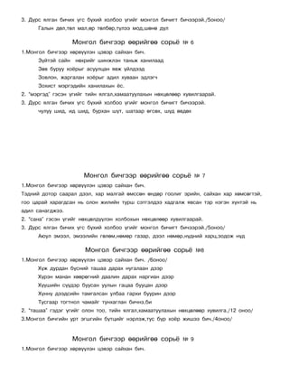àìàðúÿ,áîäóóçàé Ìîíãîë áè÷ãýý𠺺ðèé㺺 ñîðü¸ ¹ 328 1.Ìîíãîë áè÷ãýýð õºðâ¿¿ëýí öýâýð ñàéõàí áè÷. Ìîíãîë óëñûí áîëîâñðîëûí õóóëü øèíý÷ëýãäýí, áîëîâñðîëûã õºãæ¿¿ëýõ ¿çýë áàðèìòëàë áàòëàãäàí, ýíý õè÷ýýëèéí æèëýýñ ýõëýí áîëîâñðîëûí íèéò áàéãóóëëàãóóäàä ìºðäºæ ýõýëíý. Ãýíýò äàéñíû ñóì ýõ îðíîî ñýòãýëäýý òýýæ ÿâñàí áààòàðëàã ýðèéí öýýæèíä òóñàõàä í¿äèéã íü öóñ á¿ðõýâ. 2.“òàøóóðàà ºðãººä” îíöîëñîí ¿ãèéã á¿òöýýð çàäàëæ,òóñ á¿ðèéã íýðëýæ áè÷. 3.Äàðààõ õîëáîî ¿ãèéã ìîíãîë áè÷èãò áóóëãààðàé. Õàñ òàìãà, õàæóóëæ õýâòýõ, ãýðèéí õàÿã, õèéë õºãæèì, õèðñíèé ýâýð Ìîíãîë áè÷ãýý𠺺ðèé㺺 ñîðü¸ ¹329 1.Ìîíãîë áè÷ãýýð õºðâ¿¿ëýí öýâýð ñàéõàí áè÷. Áºâ Ẻðºíõèé Áºíäãºð áºìáºãèéã Áºíäãºð Ẻðººð íü Áºìáºð¿¿ëýí áºìáºð¿¿ëýí ºíõð¿¿ëíý. Á¿òýí íîìûí ñàéõàí äàðäàñ Á¿ä¿¿í ìîäíû æààõàí òàéðäàñ. 2.“ºíõºð” ãýñýí ¿ãèéã áèåýð òºãñãºõ íºõöºëººð õóâèëãààðàé. 3. Äàðààõ õýñãèéã áè÷ãèéí ãàëèãààð õºðâ¿¿ëæ áè÷. Ìîíãîë áè÷ãýý𠺺ðèé㺺 ñîðü¸ ¹330 1.Ìîíãîë áè÷ãýýð õºðâ¿¿ëýí öýâýð ñàéõàí áè÷. Òýð óðò õºðºº Ýíý õóðö ñýðýý. Ñ¿ðýã ãàëóó Ñ¿ðëýã óóëñ. Øàð øàð íàð øàðíà Øîð øîð ãîë óðñàíà. Àÿãàíä õèéñýí àéðàã Àéðãàíä õèéñýí àÿãà. 2.“óðñ” ãýñýí ¿ãèéã áèåýð òºãñãºõ íºõöºëººð õóâèëãààðàé.