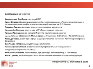 Документ представляет обсуждение финансирования программ городского развития в России с участием множества экспертов, где рассматриваются ключевые меры для улучшения градостроительной политики. Обозначены три принципиальных направления: децентрализация, федеральное инвестиционное финансирование и выбор первоочередных шагов. Особенное внимание уделяется необходимости вовлечения местных сообществ и молодежи в градостроительное планирование.