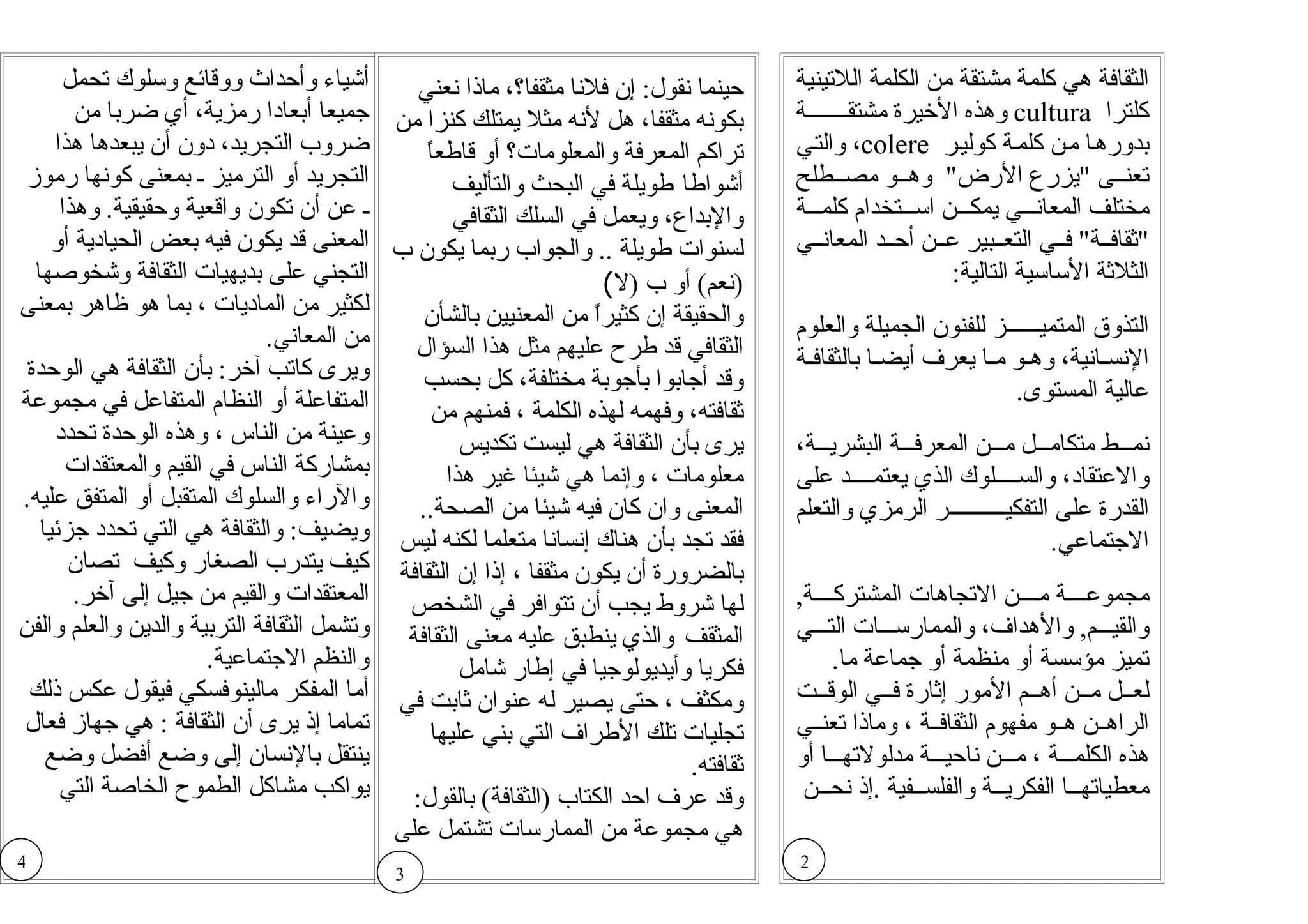 تعبر الثقافة عن استيعاب فهم وهضم الأيديولوجيات المختلفة عبر الزمان، وتمثل النشاطات الإنسانية المختلفة مثل الدين والفن والعلم. يناقش النص آراء متنوعة حول تعريف الثقافة وتفاعلها مع المجتمع، ويشير إلى أن الثقافة ليست مجرد تكديس المعلومات بل تشمل القيم والمعتقدات والسلوكيات. تعلن نهايات مختلفة عن الثقافة كأداة تحوّل اجتماعي وتقدم في الحُقبة الزمنية.