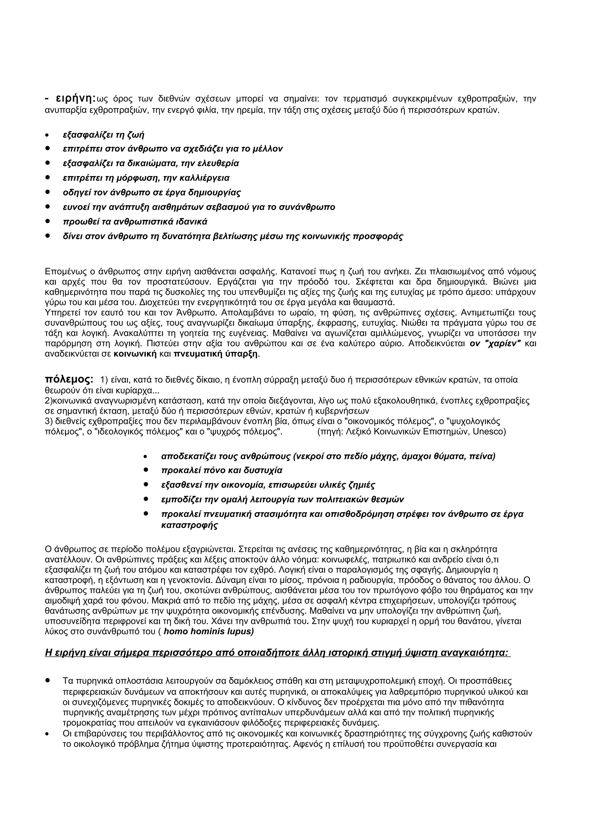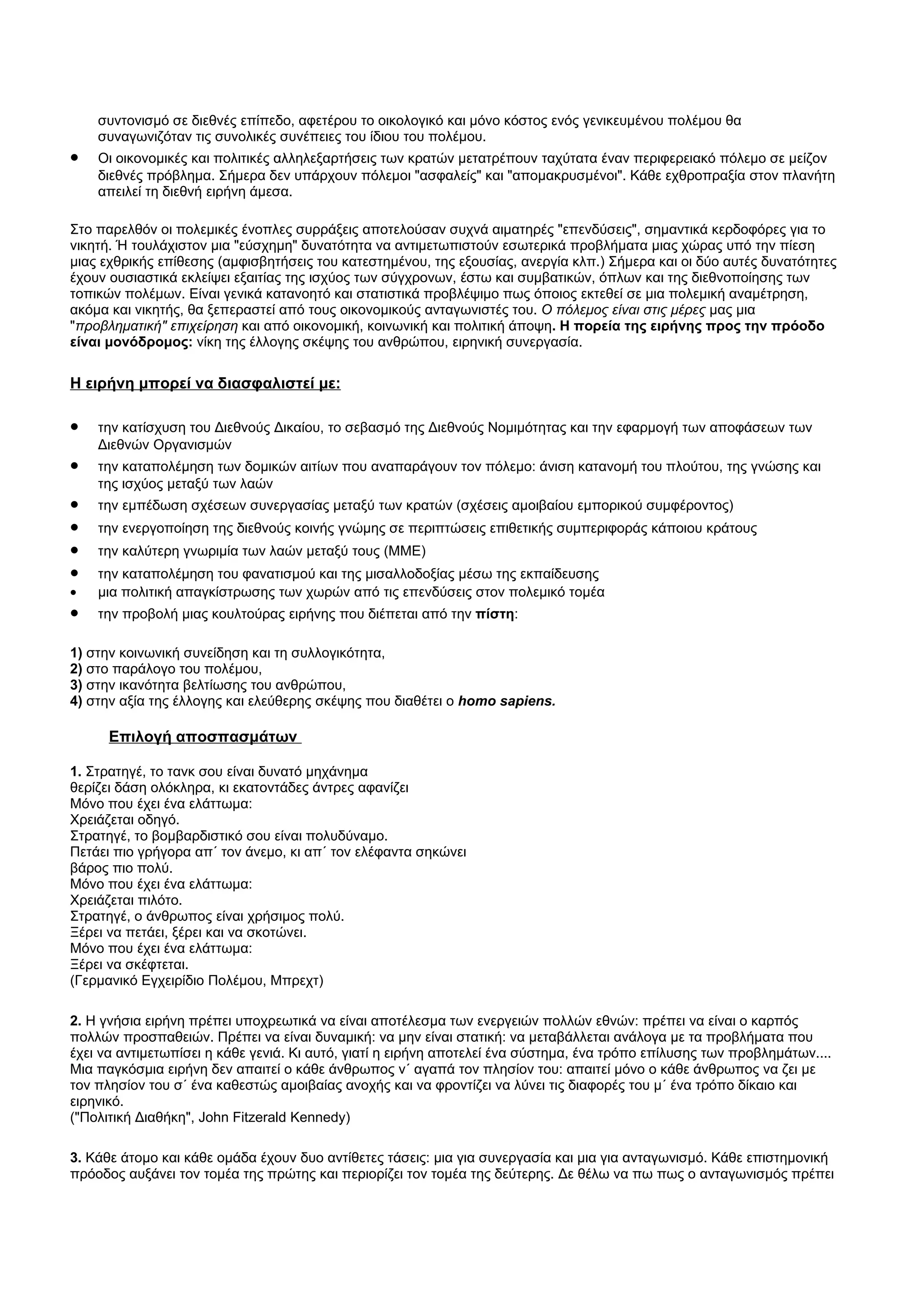 έχει να αντιμετωπίσει η κάθε γενιά. Κι αυτό, γιατί η ειρήνη αποτελεί ένα σύστημα, ένα τρόπο επίλυσης των προβλημάτων....