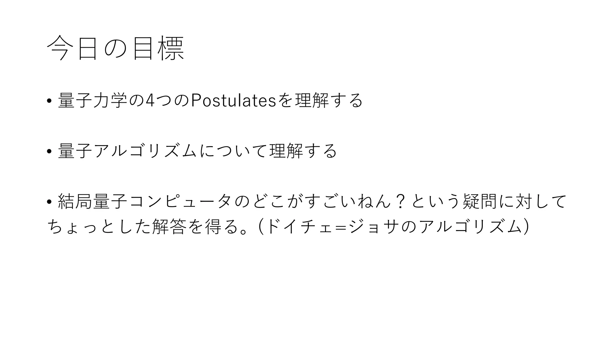今日の目標 • 量子力学の4つのPostulatesを理解する • 量子アルゴリズムについて理解する •