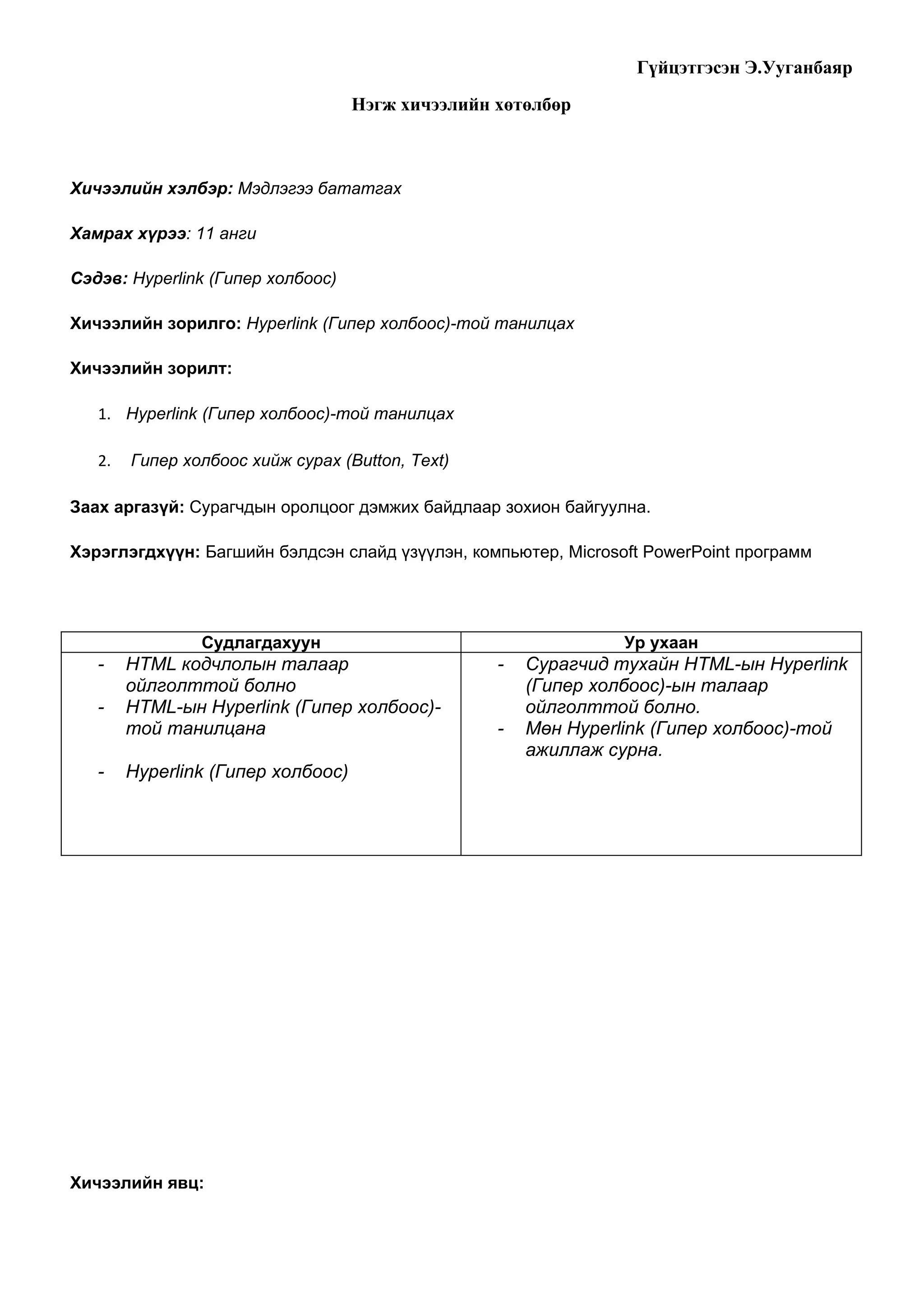 Хичээлийн зорилго: Hyperlink (Гипер холбоос)-той танилцах