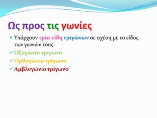 Υπάρχουν τρία είδη τριγώνων ςε ςχέςη με το είδοσ
