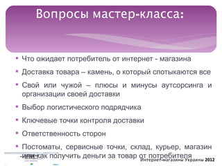 Документ анализирует аспекты логистики для интернет-магазинов в Украине, включая ключевые вопросы доставки, выбор логистических подрядчиков и потребительские ожидания. Указывается на рост рынка e-commerce и проблемы, с которыми сталкиваются онлайн-торговцы, такие как управление доставкой и концентрация на качестве услуг. Предлагаются рекомендации по выбору надежных подрядчиков и оптимизации логистических процессов.