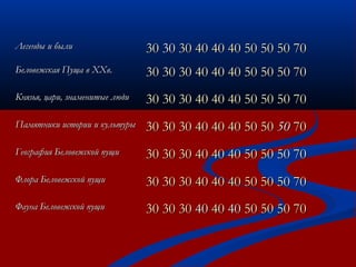 Документ содержит информацию о беловежской пуще, включая историю, географию, флору, фауну, культурные памятники и известные личности, связанные с этим местом. Рассматриваются важные события и изменения, произошедшие в пуще на протяжении веков, включая охоту, войну и природные катастрофы. Также упоминаются значимые археологические находки, памятники и экосистемные проблемы, с которыми сталкивается данный регион.