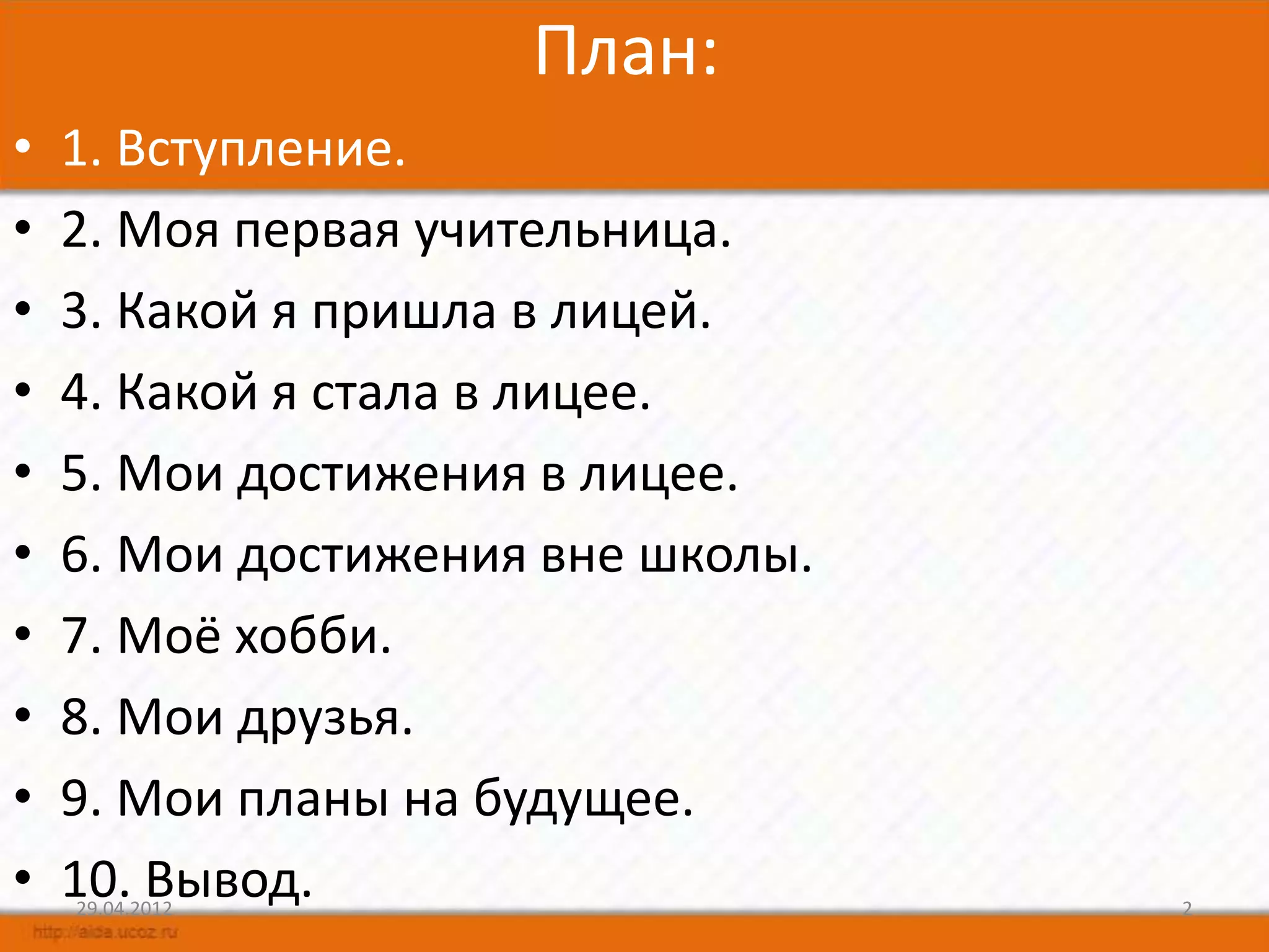 Документ представляет собой проект ученицы начальной школы о её учебном пути и достижениях. В нём рассказывается о первой учительнице, опыте в лицее и вне учебной деятельности, хобби и будущих планах. Автор выражает надежду сохранить дружбу с одноклассниками и продолжать развиваться в выбранной сфере.