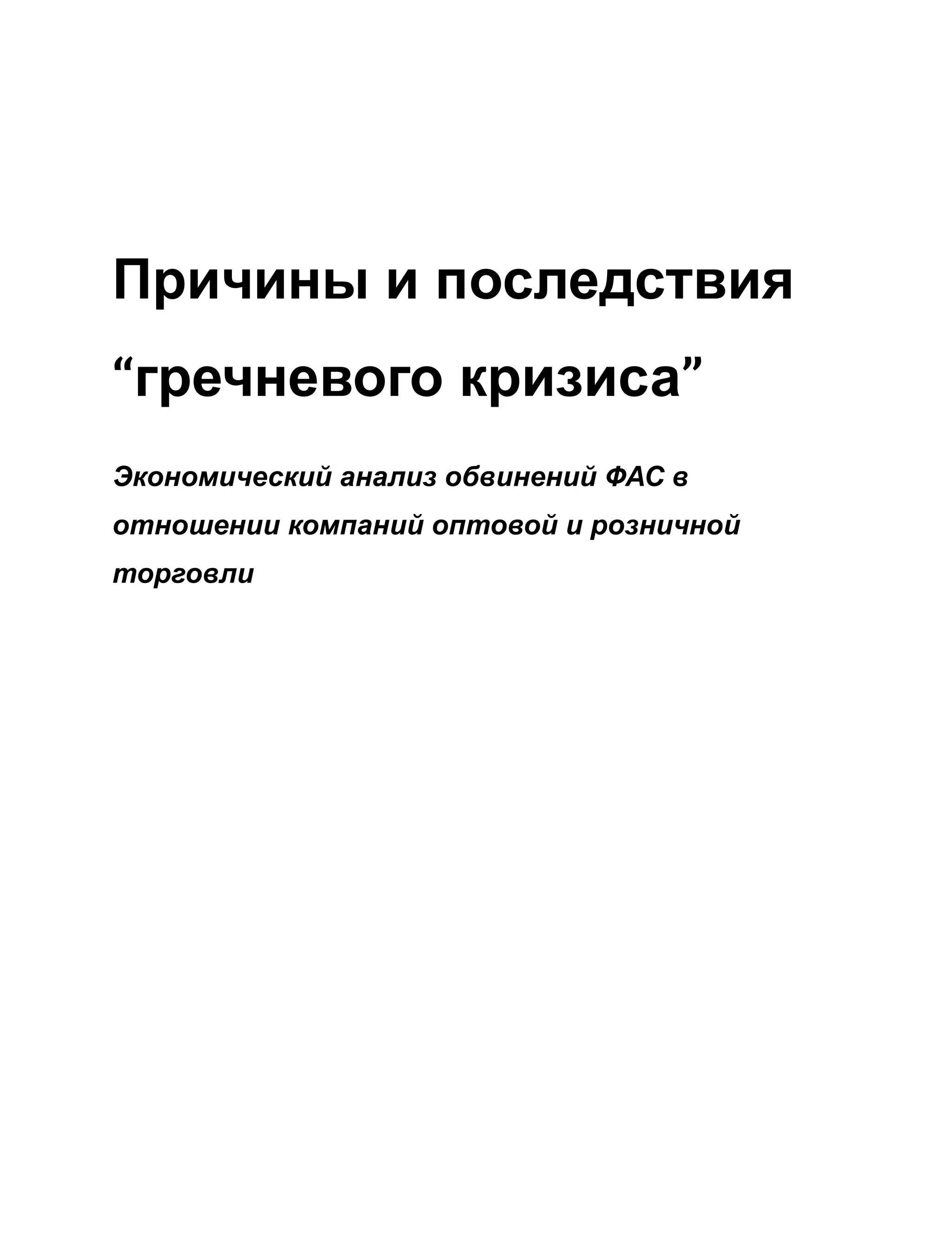 Доклад анализирует причины и последствия так называемого 'гречневого кризиса' в России, связанного с резким ростом цен на гречневую крупу. Основными факторами подорожания стали сочетание увеличения спроса и снижения предложения, а не сговор на рынке. Государственное вмешательство в виде антимонопольных дел не привело к снижению цен, указывая на неэффективность таких мер.