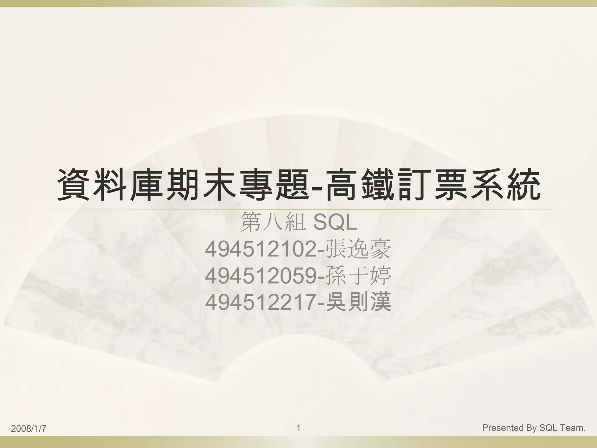 This document presents a train ticket reservation system built using SQL Server 2005, ASP.NET, and JDBC. It includes the system architecture, schema, functionality list, front-end and back-end programs, and a demo. Future improvements discussed are website beautification, adding more humanized features, and including thread management in the administrator interface.