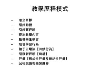 確立目標 – 引起動機 – 引起舊經驗 – 提出教學內容 – 指導學生學習 – 展現學習行為 – 給予正增強【回饋行為】 – 引發新經驗【建構】 – 評量【形成性評量及總結性評量】 – 加強記憶與學習遷移