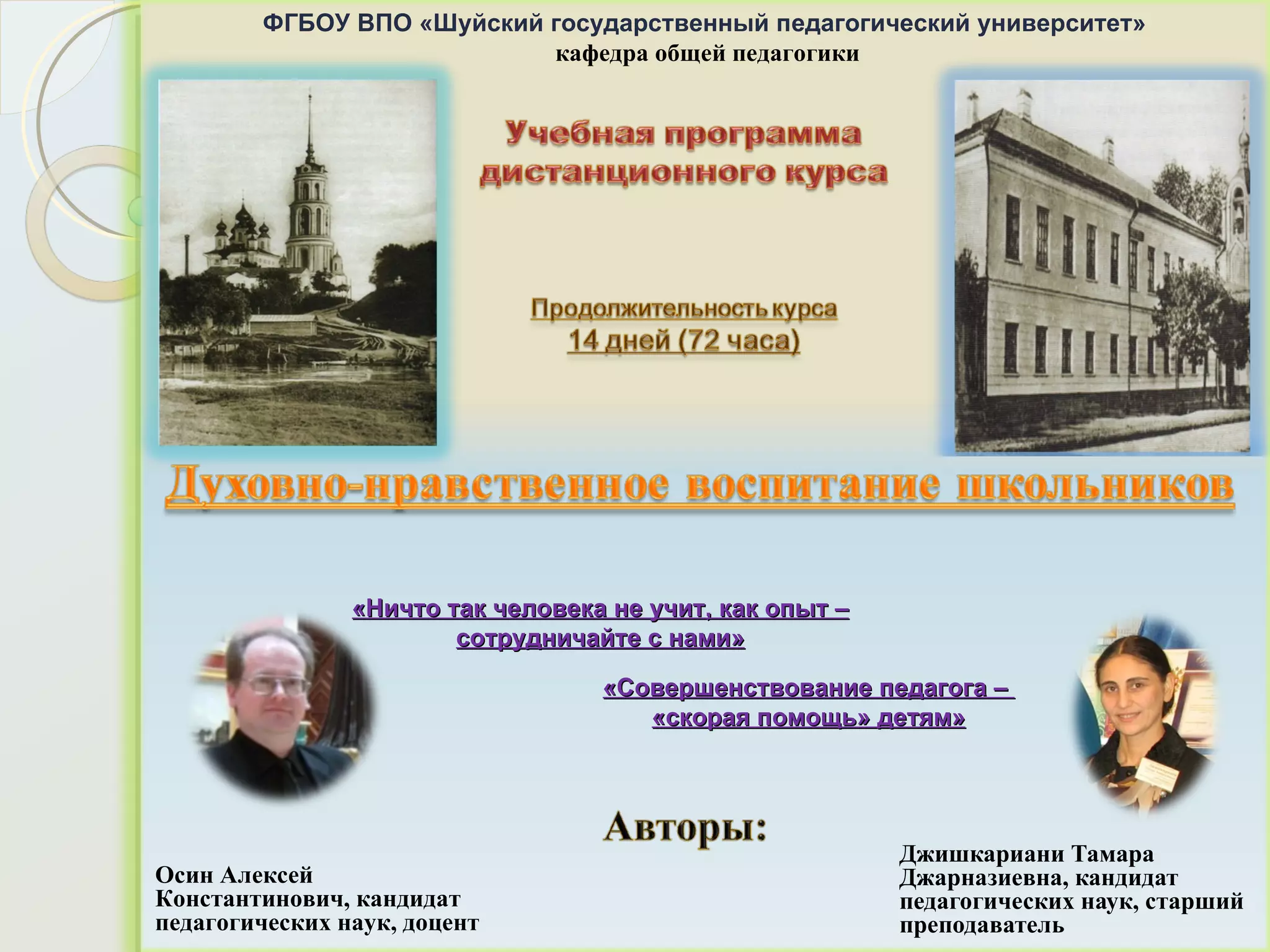 Документ представляет курс по повышению квалификации педагогов, который фокусируется на духовно-нравственном воспитании школьников. Он предназначен для учителей и методистов, особенно тех, кто работает с модулем 'Основы православной культуры'. Цель курса - развитие профессиональной компетентности педагогов в соответствии с новыми стандартами общего образования.