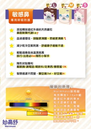 妙鼻舒Warmnaso暖鼻包 敏感鼻專用呼吸防護 *添加釋放遠紅外線的天然礦石,舒緩鼻部敏感不適 *TTRI實測鼻腔血液循環提升26.4%,避免溫濕差異刺激 *阻隔花粉/塵螨/霉菌/粉筆灰/灰霾沙塵/寵物皮屑等過敏原 *隱藏於鼻腔內的輕薄柔軟口罩,生活更便利,配戴不悶熱 <誰最需要?> (1) 兩岸台商/台幹出差必備,預防沙塵暴/霾害/霧滴危害健康。 (2) 空姐/導遊/領隊登機箱內不可少,避免乾冷高空造成鼻部不適。 (3) 背包客/自助旅行戴著好,輕鬆適應各地溫濕差異。 (4) 海外僑胞/移民超推,不用擔心花粉症上身。 (5) 敏感鼻水水&花美男最有感,再也不用紅鼻子見人了。