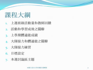 本文件概述了體適能課程的教學大綱,包括班級活動量、體適能成績、及大隊接力對體適能的影響。學生被鼓勵設定個人目標,並於討論區分享其活動計劃及挑戰。最後,重點強調了確定具挑戰性的可測量目標以提高體適能的重要性。
