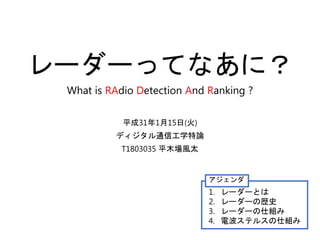 Detection And Ranking ? 平成31年1月15日(火) ディジタル通信工学特論 T1803035 平木場風太 アジェンダ 1. レーダーとは 2. レーダーの歴史 3. レーダーの仕組み 4. 電波ステルスの仕組み