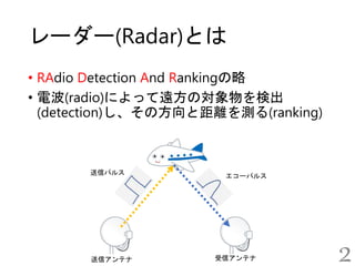 And Rankingの略 • 電波(radio)によって遠方の対象物を検出 (detection)し、その方向と距離を測る(ranking) 2 送信パルス エコーパルス 受信アンテナ送信アンテナ