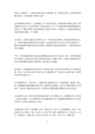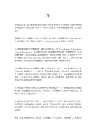 本書旨在彌補系統程式與系統軟體教學上的市場落差,它同時涵蓋系統軟體理論與實務,專注於 c 語言及組合語言的相關內容,以促進學生對電腦運作原理的理解。書中提供了簡化版處理器的操作與 GNU 開發工具的實際應用,並透過網路資源持續更新教學材料。作者希望此書成為一部理論與實務兼具的系統程式教科書,推動學生成為優秀的系統程式設計師。