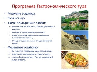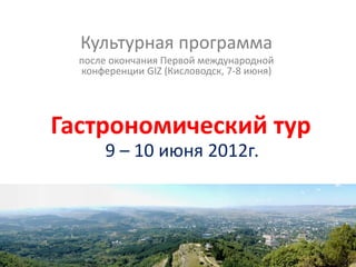 Документ описывает культурную программу гастрономического тура, который пройдет в Кисловодске с 9 по 10 июня 2012 года после международной конференции GIZ. Участники смогут насладиться экскурсиями и традиционными блюдами кавказской кухни, включая уху из форели, осетинские пироги и шашлык. Дополнительная информация о программе и стоимости участия будет предоставлена позже, регистрация открыта до 20 мая.
